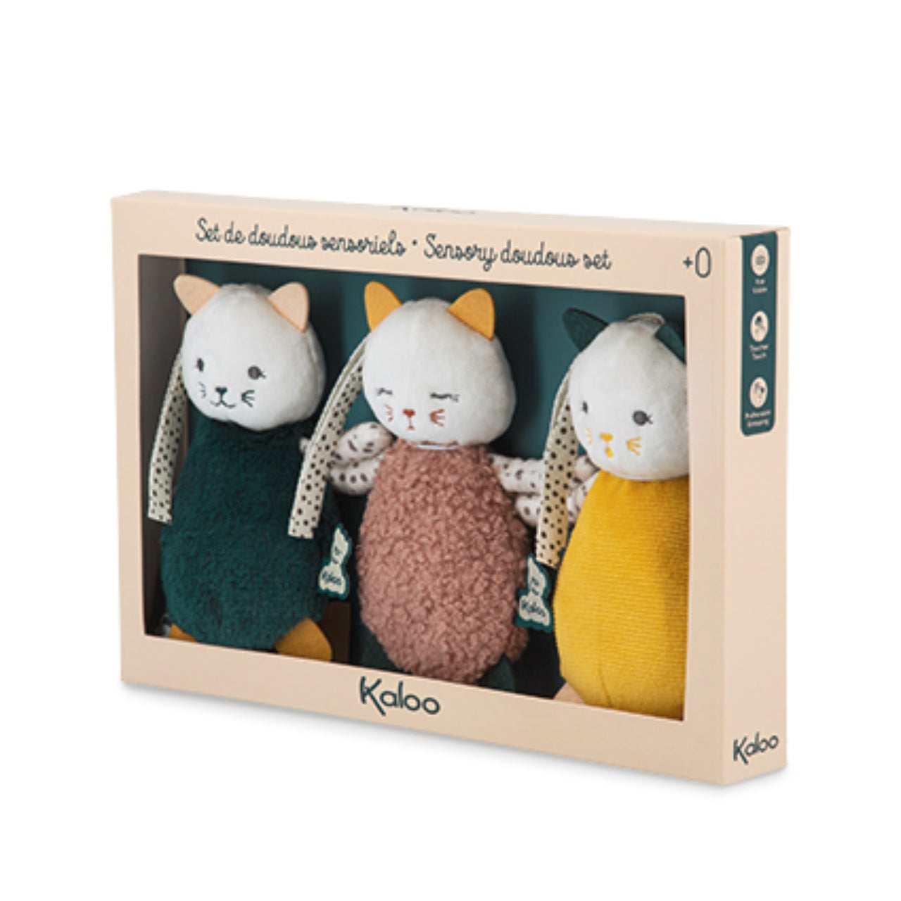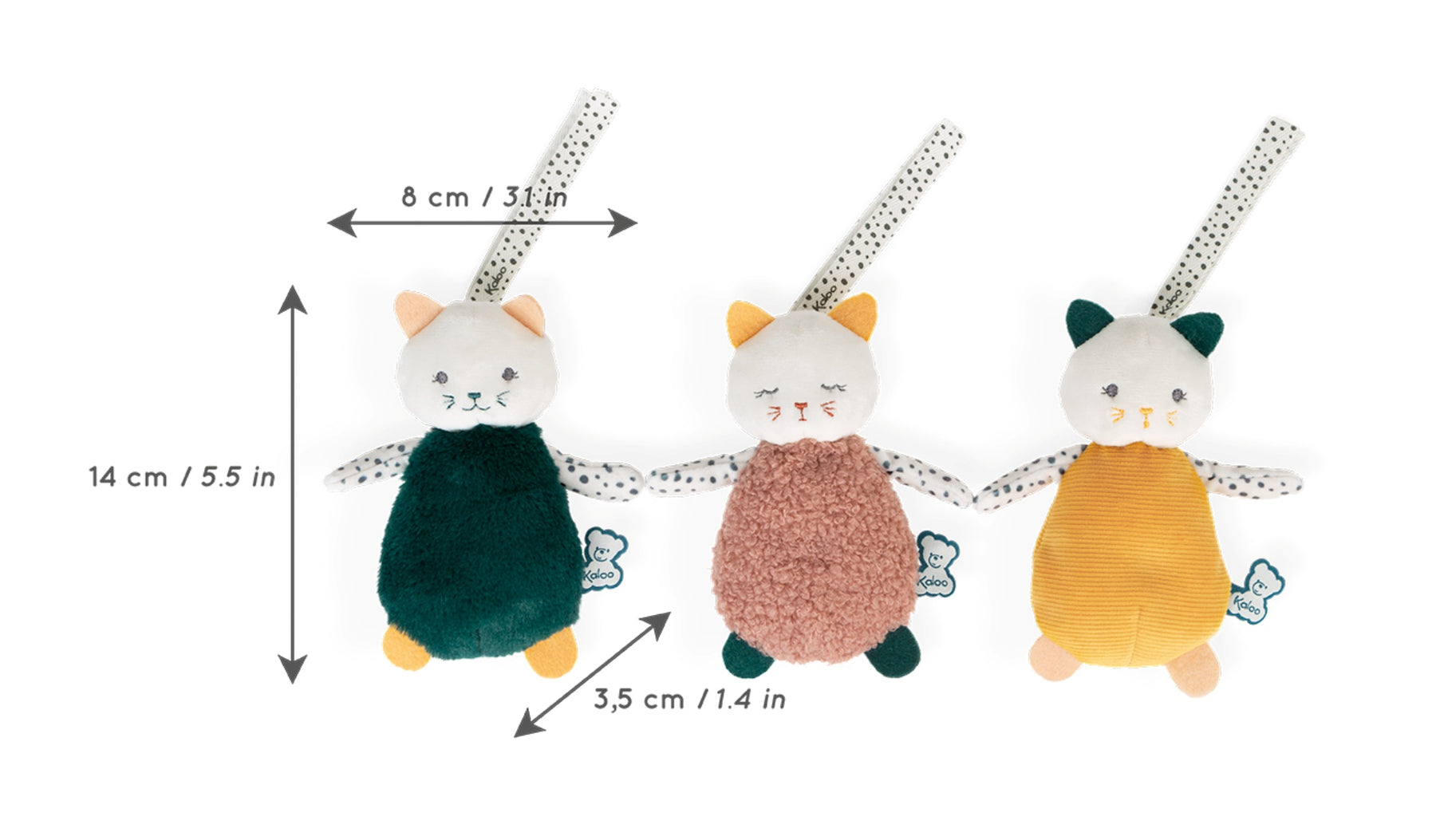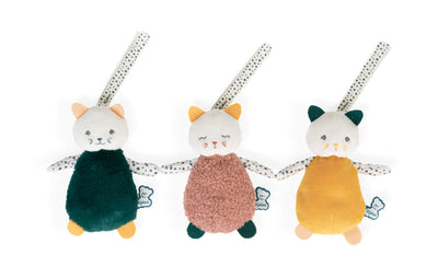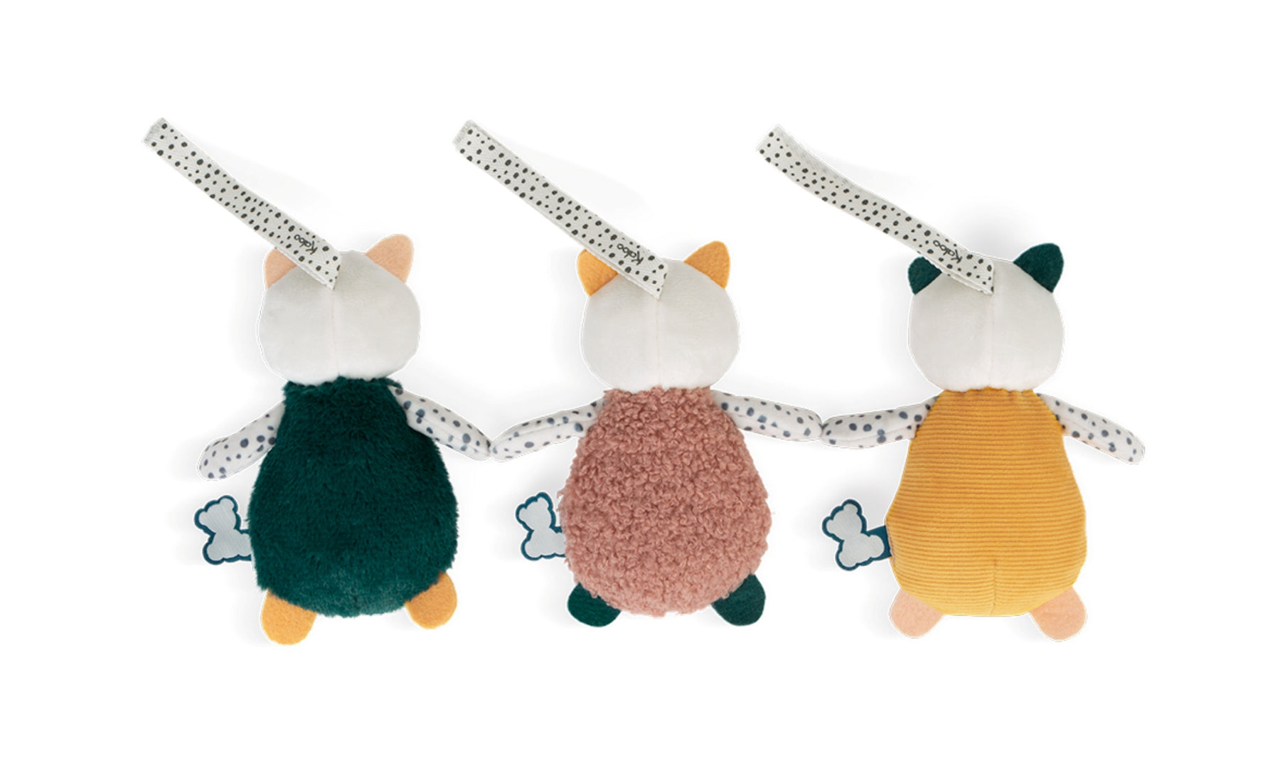 The three cats are different colours with different facial expressions. They are made of different fabrics, with different textures. They are filled with different materials, one with conventional, quiet stuffing, one with noisy, crinkly material and the third with beads.