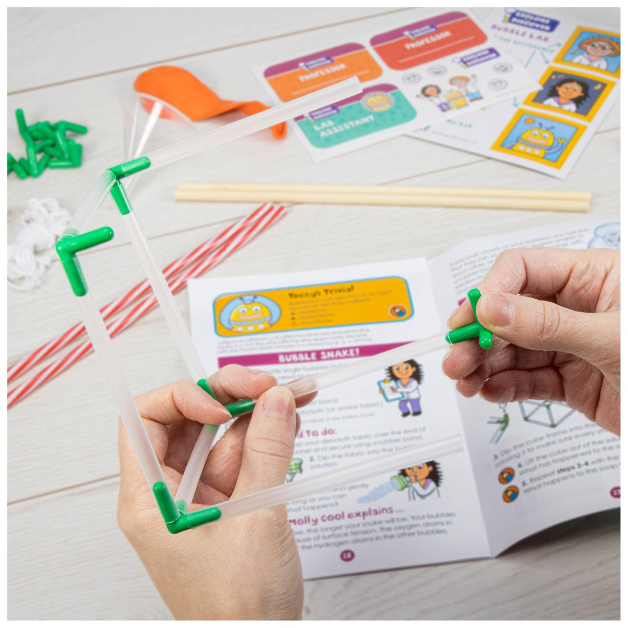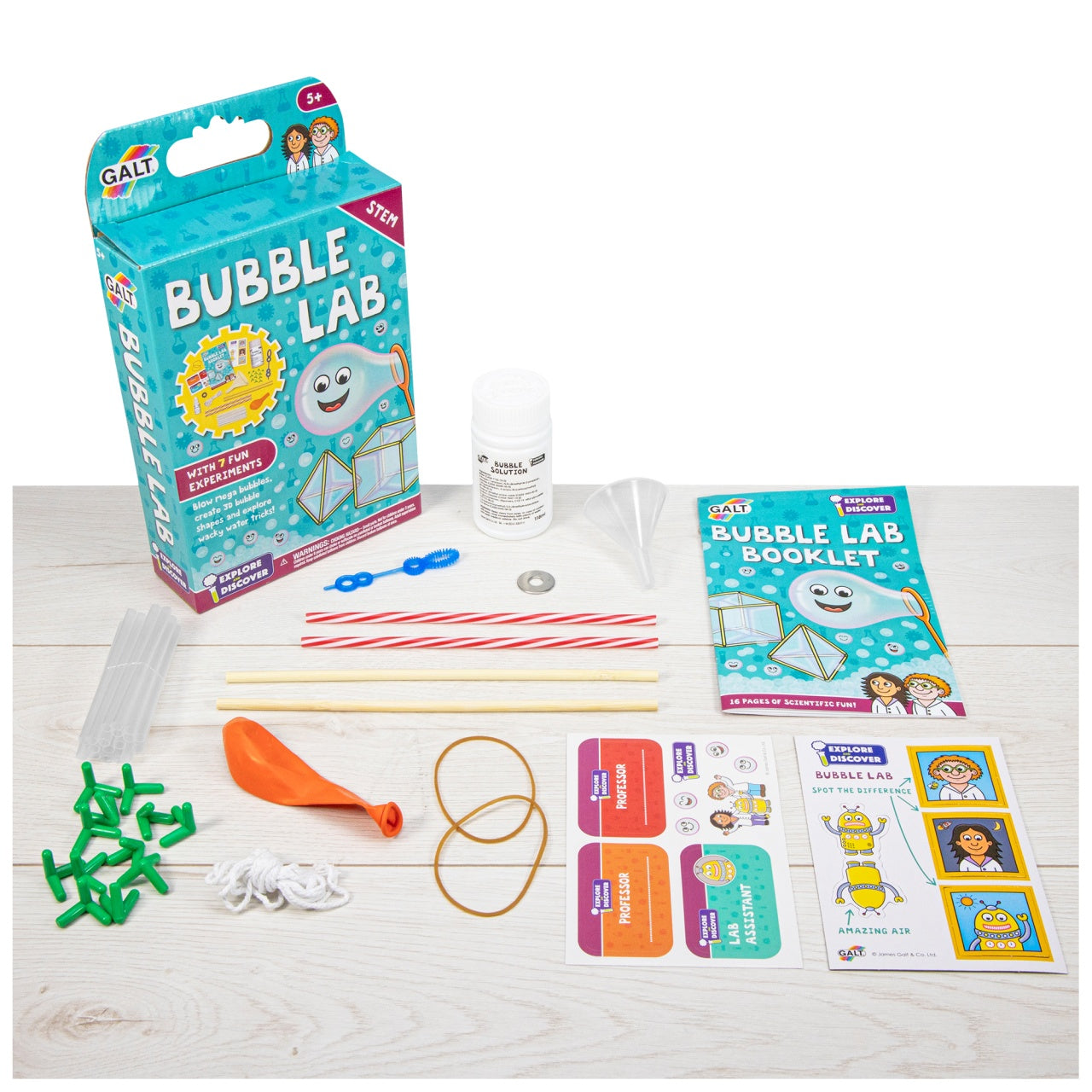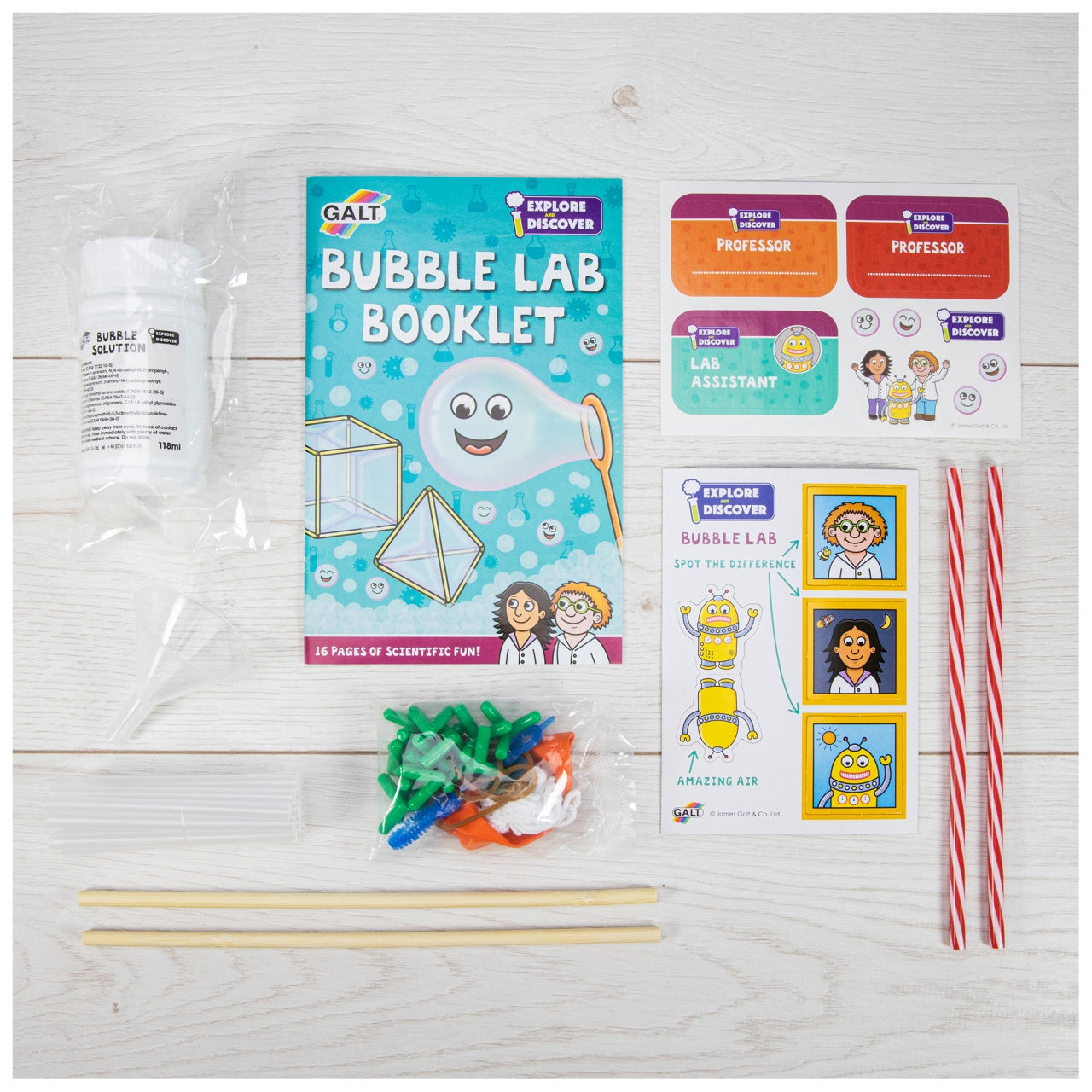 Contents: bubble solution, bubble wand, glycerine, funnel, 2 wooden sticks, 12 connectors, 20 reusable straws (18 clear and 2 striped), balloon, 2 rubber bands, string, washer, printed card pieces, stickers and full colour 16-page Lab booklet.