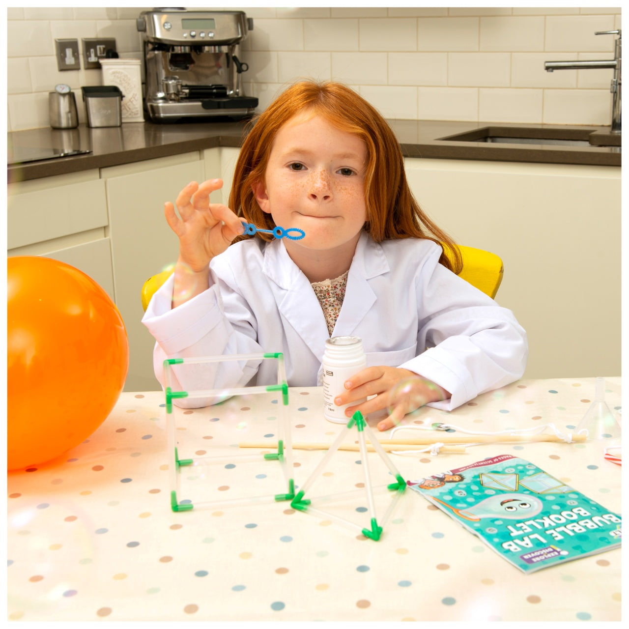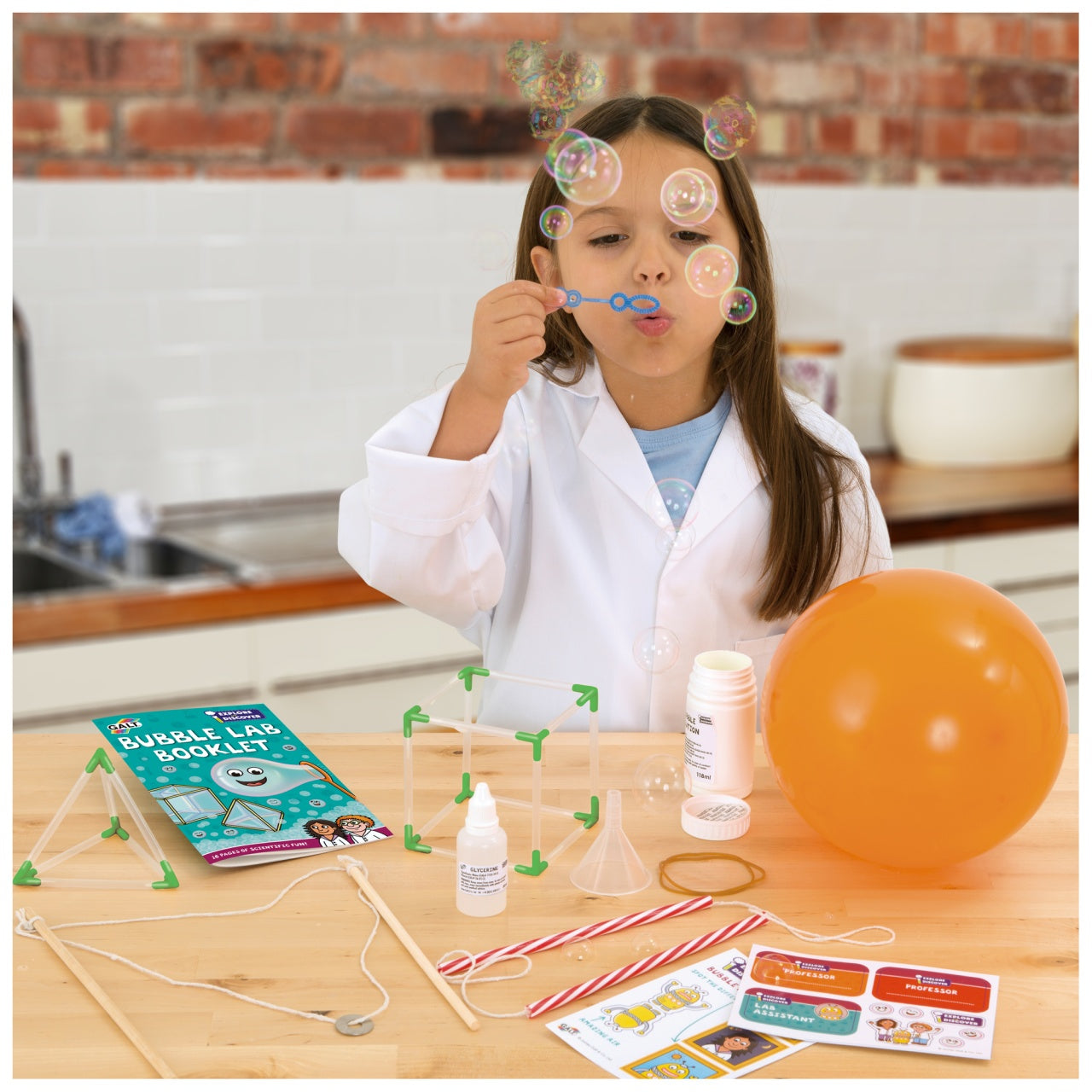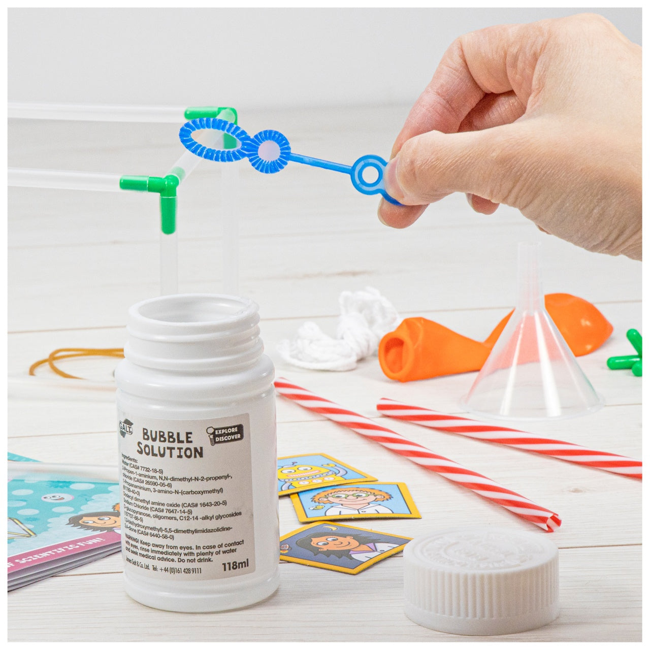 Contents: bubble solution, bubble wand, glycerine, funnel, 2 wooden sticks, 12 connectors, 20 reusable straws (18 clear and 2 striped), balloon, 2 rubber bands, string, washer, printed card pieces, stickers and full colour 16-page Lab booklet.