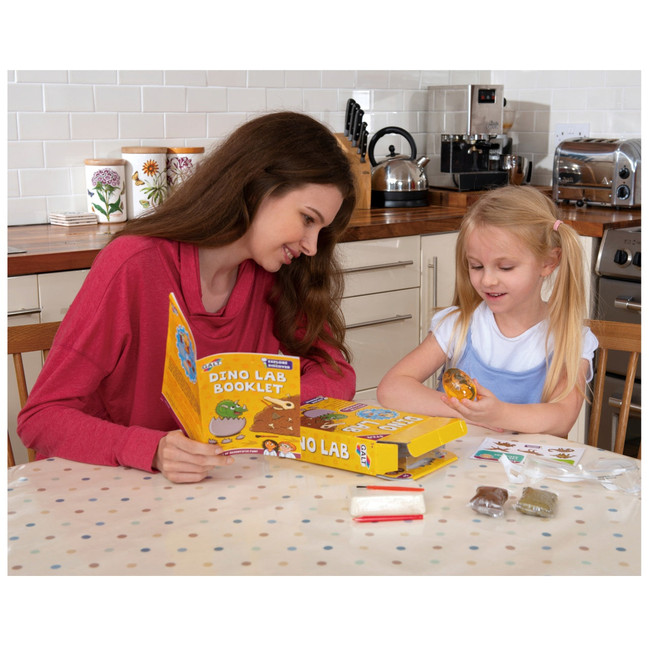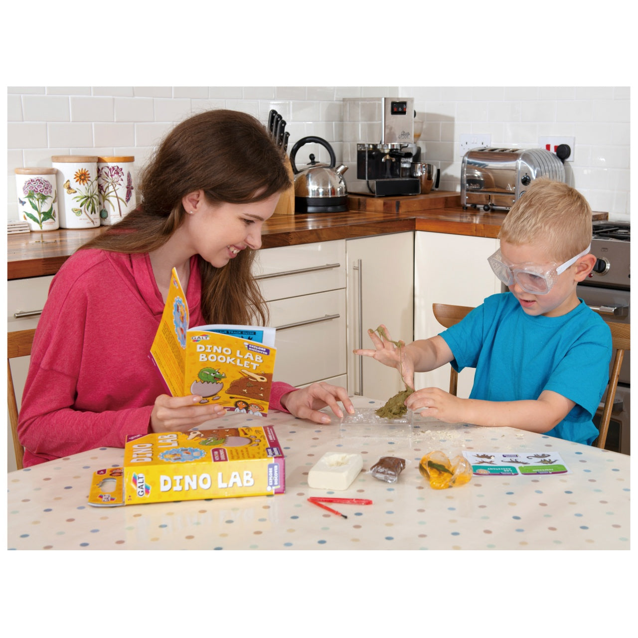 Contents: dig out dino fossil excavation stone, excavation tools, play goggles, amber slime with dinosaur, air-drying clay, dinosaur tracks mould, stickers and full colour 16-page Lab booklet.