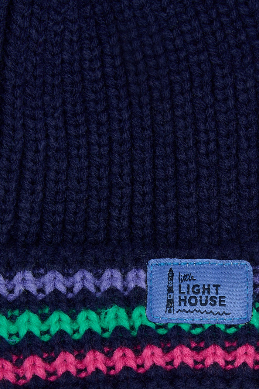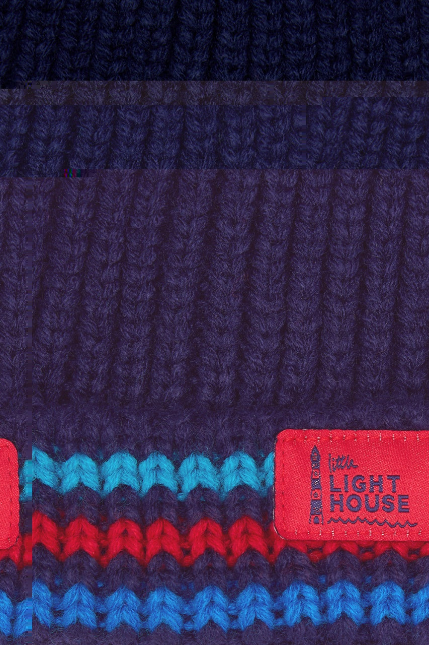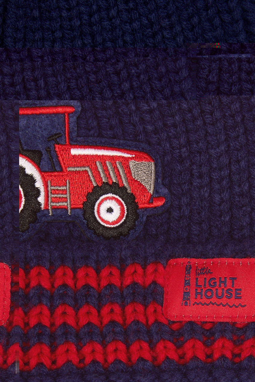 Smart navy rugby shirt with stripy sleeves and a green tractor applique,