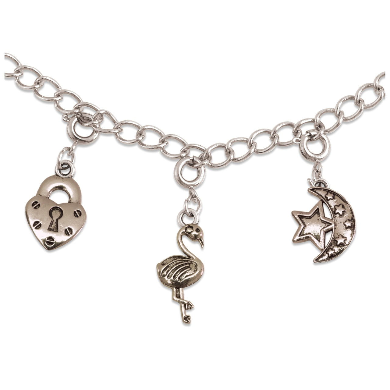 Contains 6 coloured metal charms, 3 silver charms with fasteners, bracelet chain, 300 assorted silver coated and coloured beads, elastic, needle, cotton, guide.
