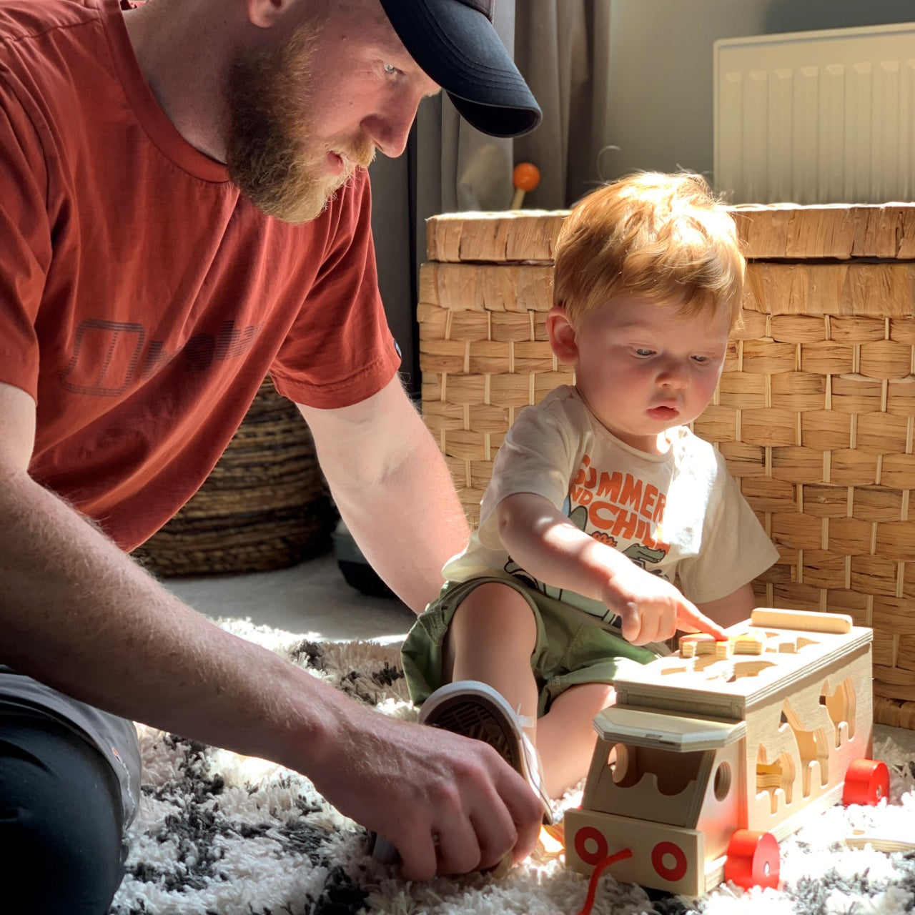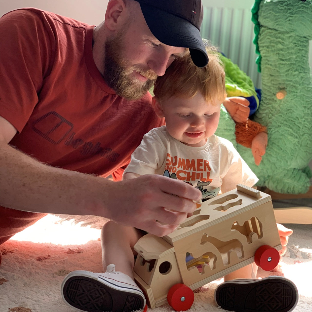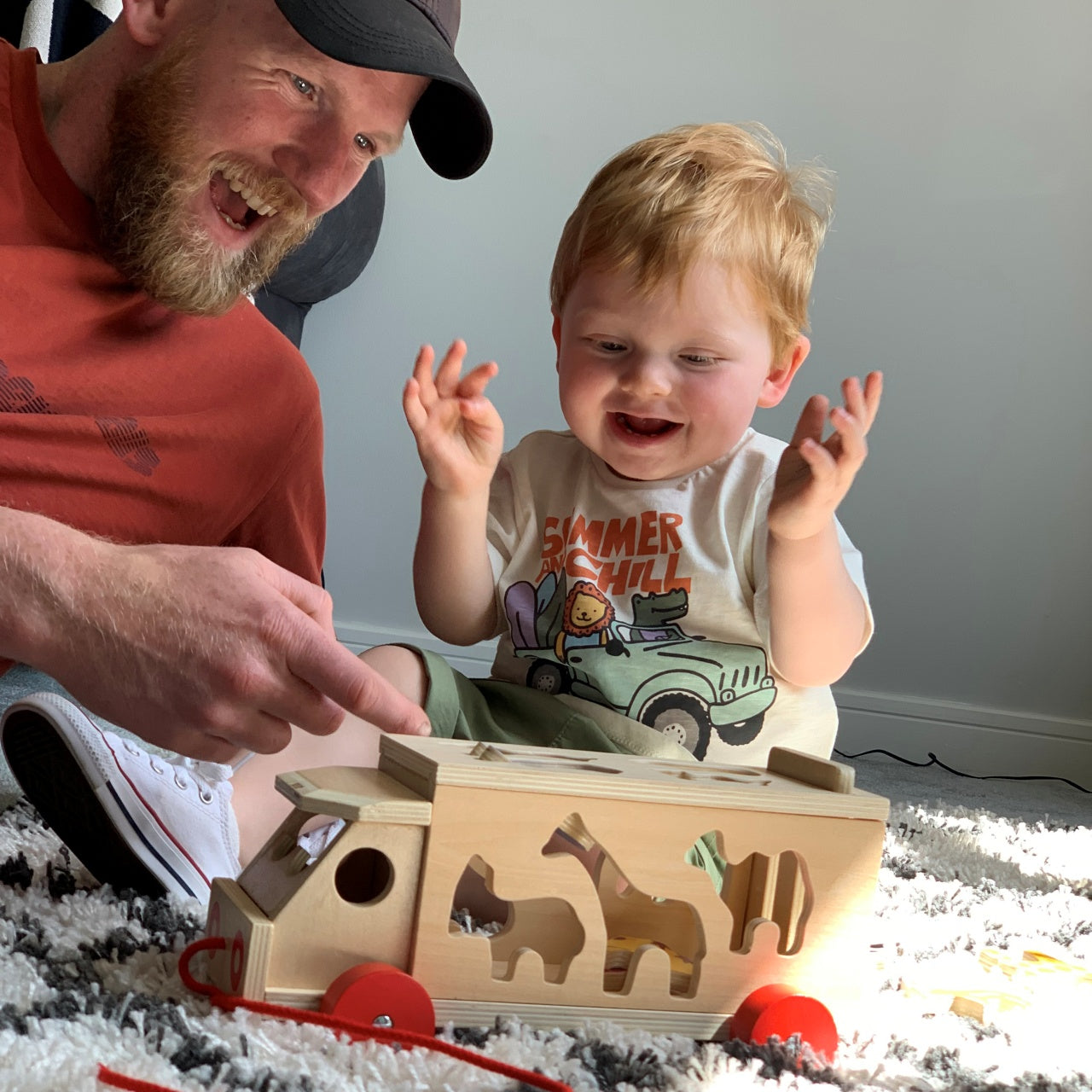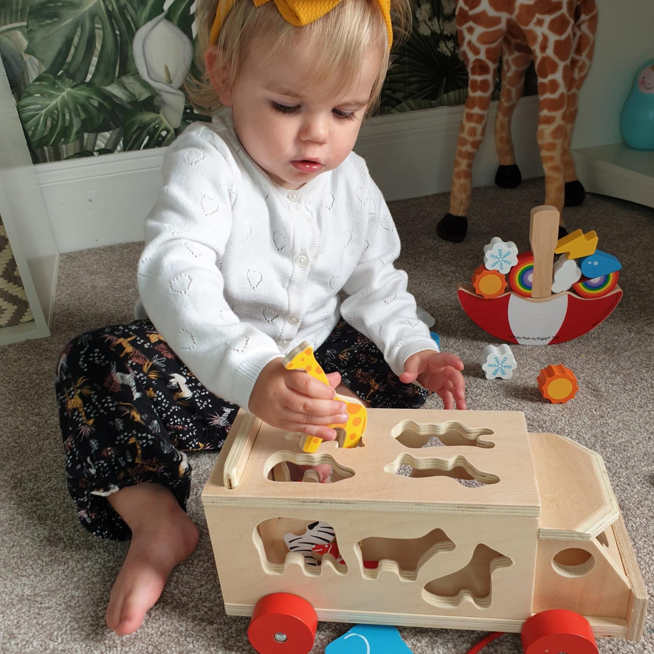 Wooden lorry to pull along, with holes cut out in the sides to push the ten brightly-coloured animal shapes through.  The rear door lifts up to retrieve them.