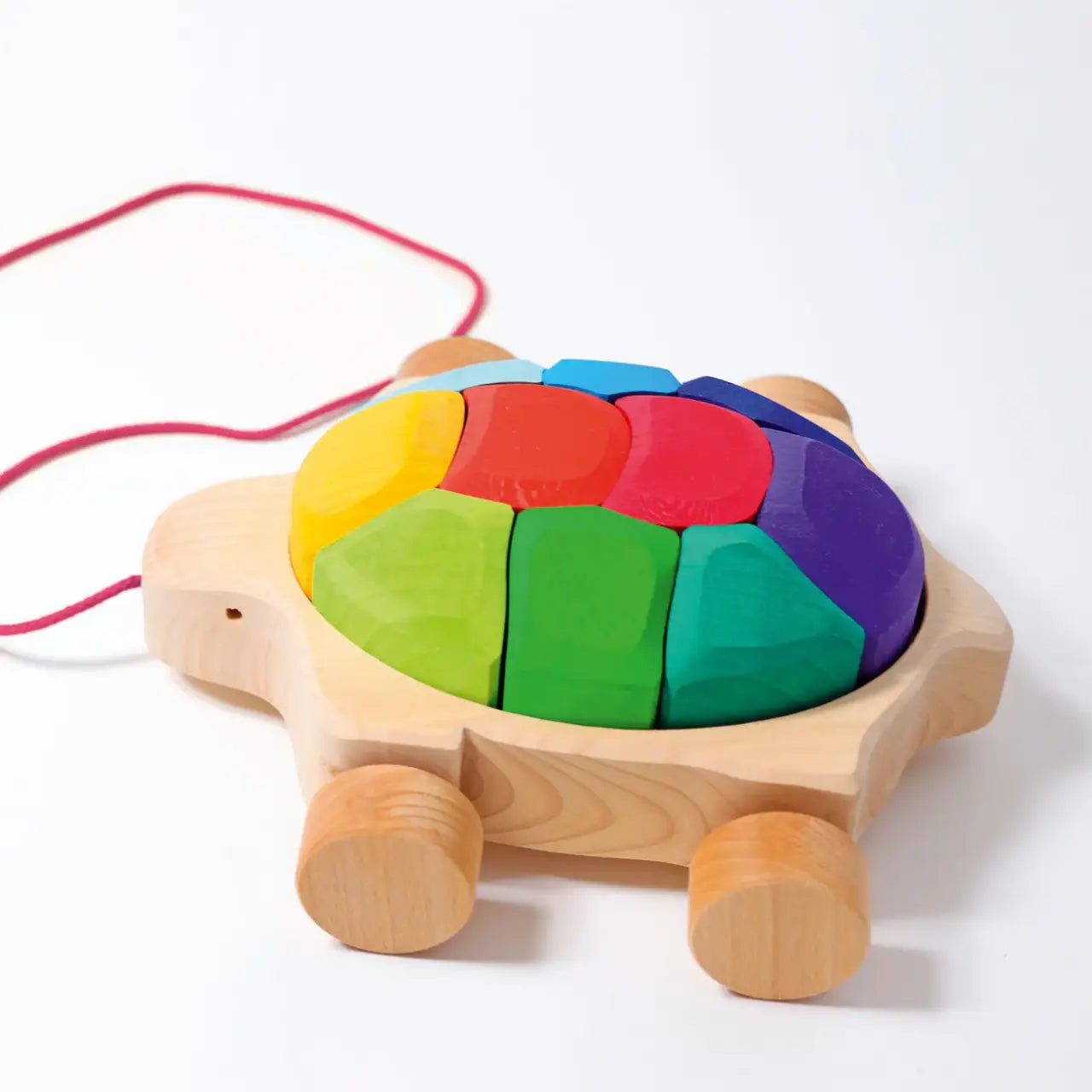 Made from a lime wood, this sweet blue tortoise has ten rainbow-coloured building blocks as its shell.