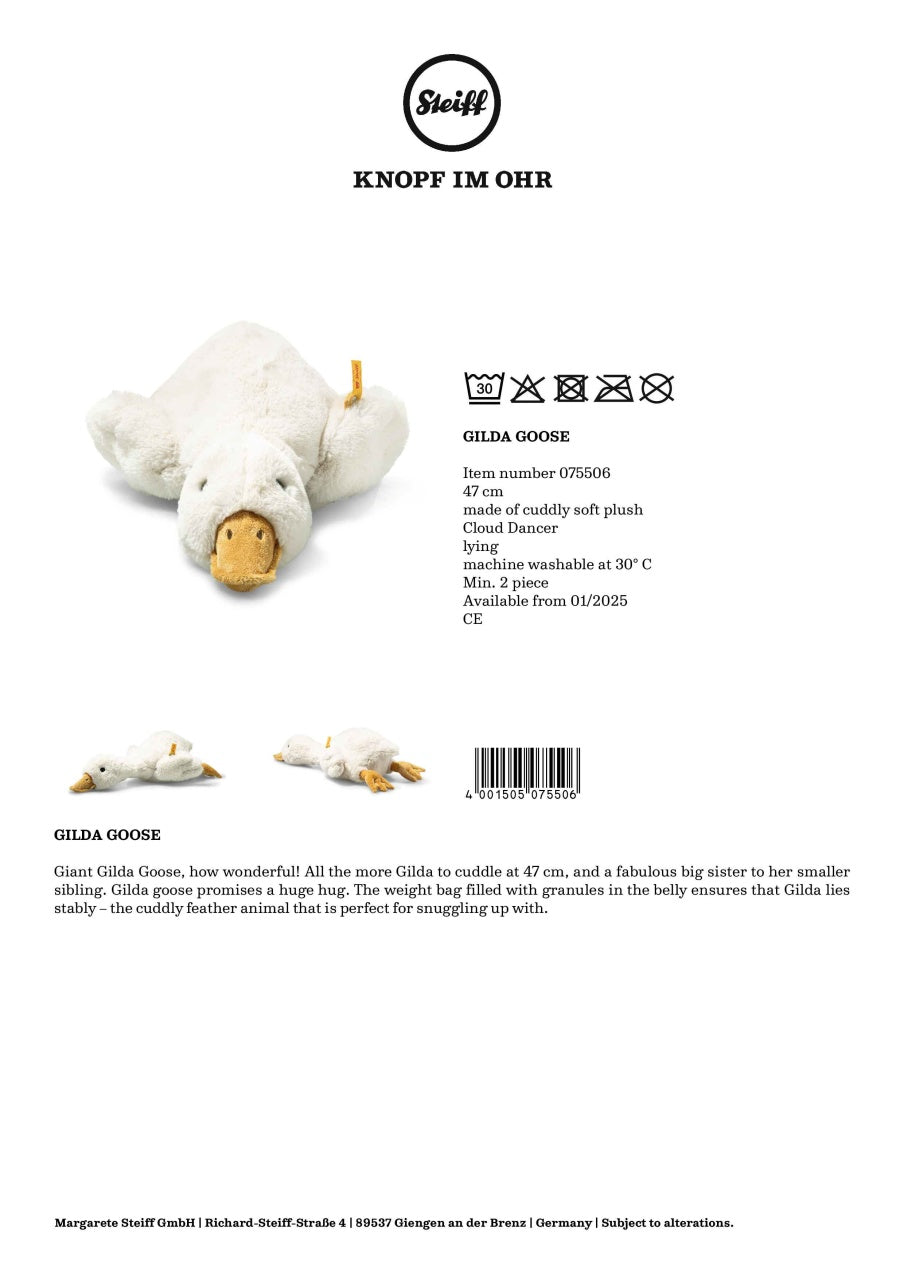 Big white goose to cuddle up with, from Steiff. Made with their renowned attention to quality and child safety.