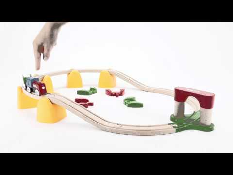 This set includes 1x battery-powered engine, 1x truck carrying a spinning reel, 4x ramps, 1x bridge made up of 1x stacking curve and 2 wooden columns, 7x curves, 2x sloping track segments and 5x supports.