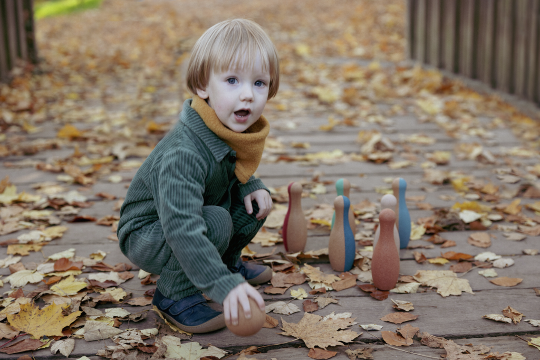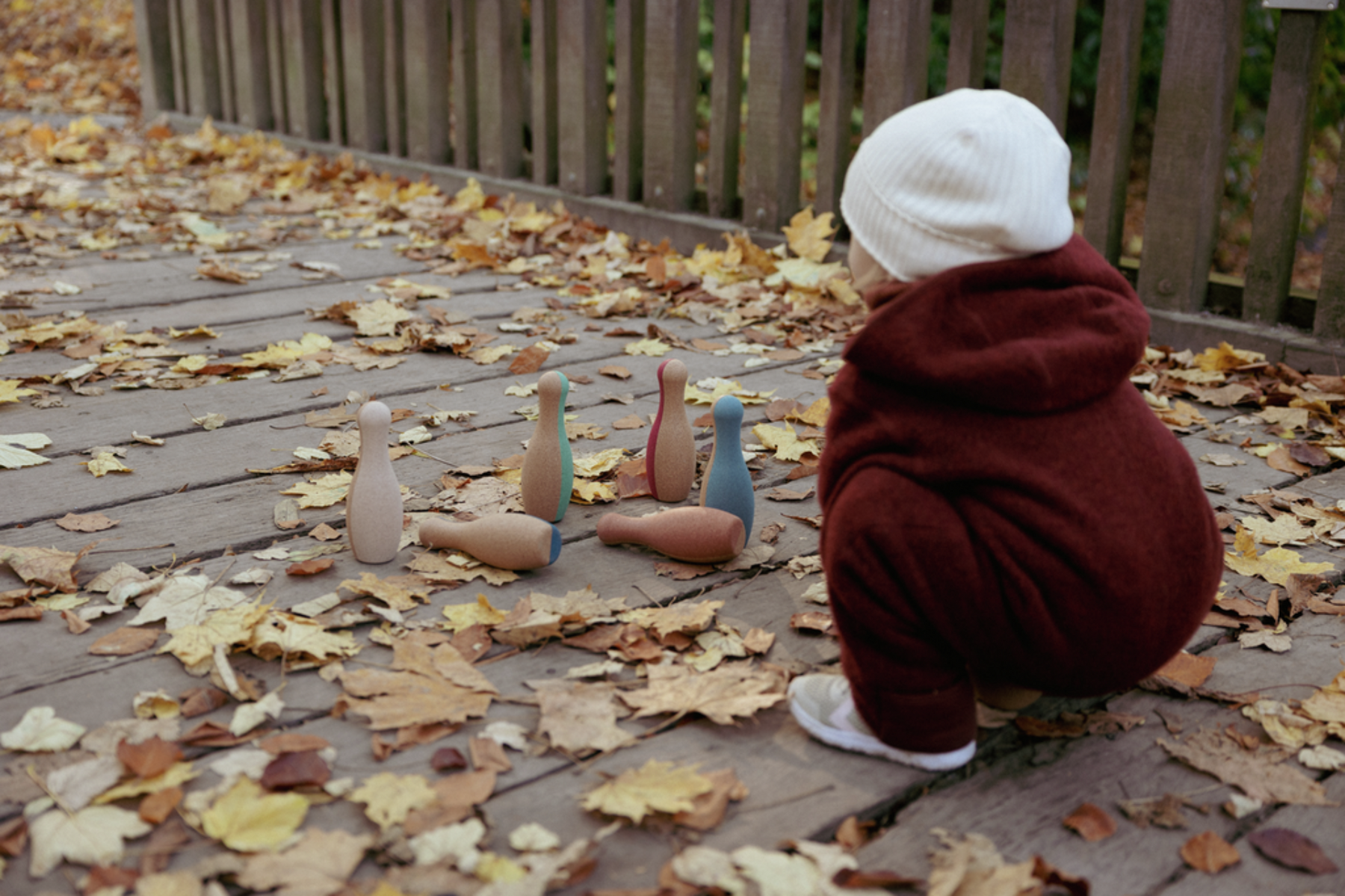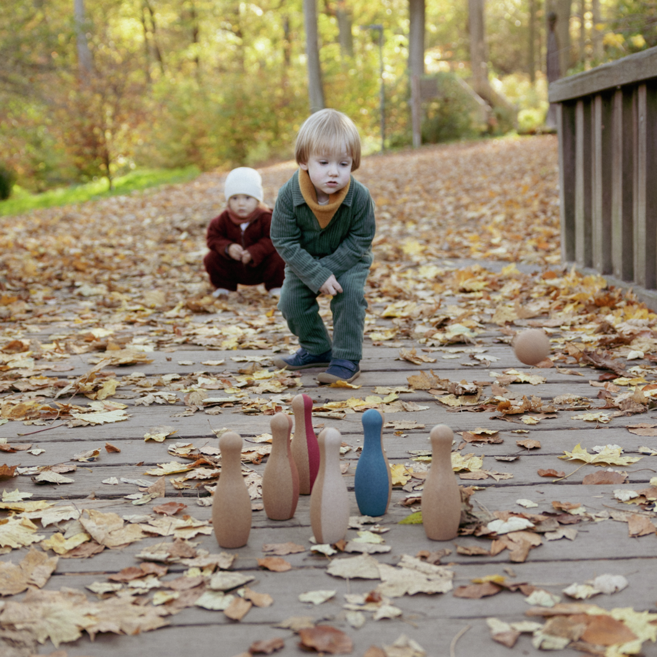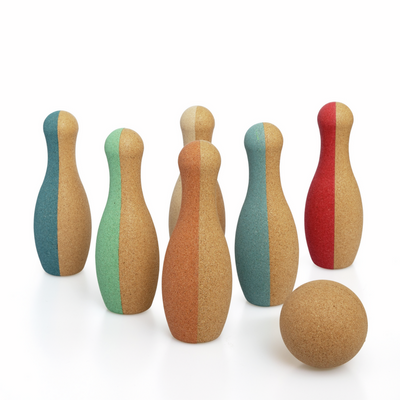 Cork has to be the ideal material to use for a set of skittles for young children. It is light, soft, quiet and very forgiving. A toddler's aim isn't always perfect but the cork ball is unlikely ever to cause much damage. Moreover cork is 100% natural, sustainable, biodegradable, and carbon negative.