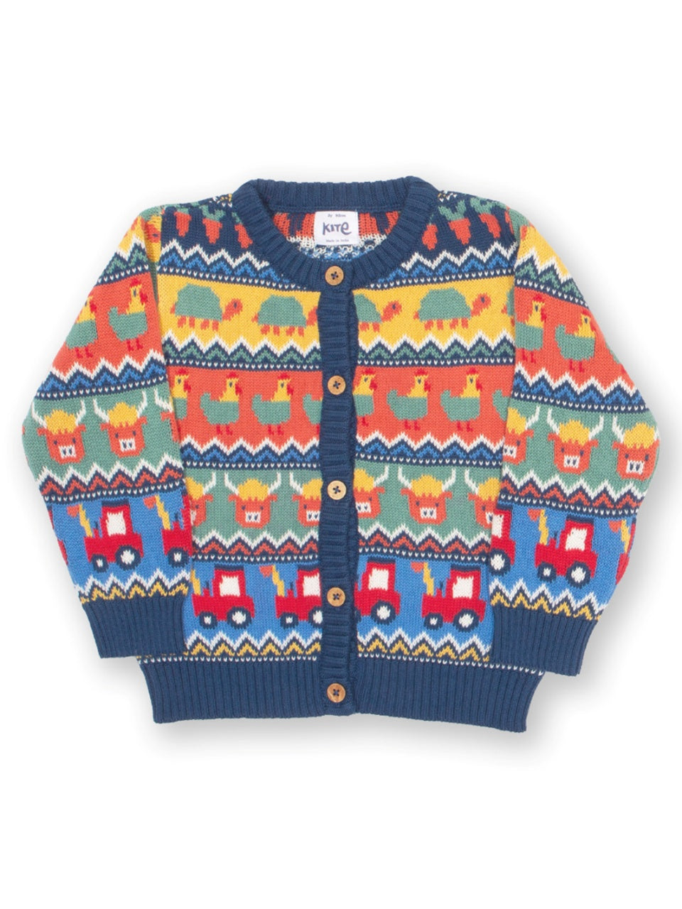 Regular price £35.00 Save £-35.00Soft organic cotton cardigan. Fair isle design with a slightly odd mixture of designs - tractors, highland cows, chickens and tortoises.